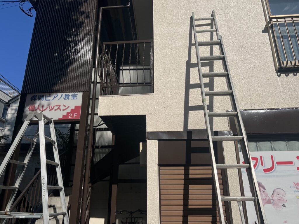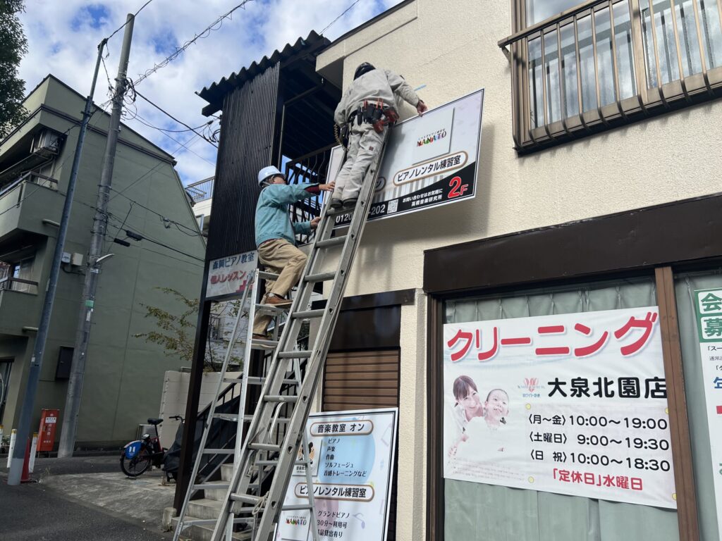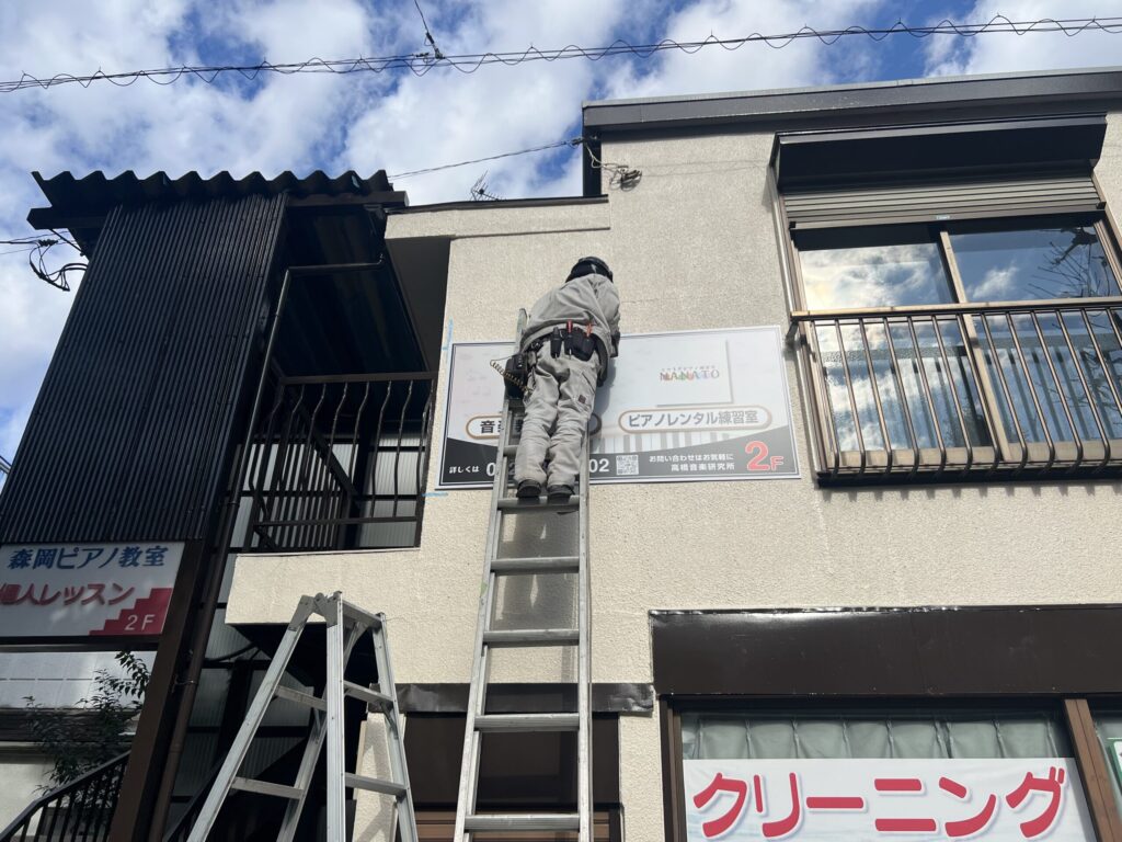 朝から職人さんが入り、はしごを立てて、下地作り → 新しい看板の設置と、丁寧に作業を進めてくださいました。