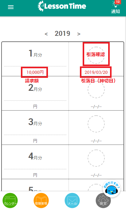 レッスンタイムにアクセスすると、トップページに表示されます。スマートフォンは、下の方にスクロールしてください。該当月のところをクリックすると詳細が出てきます。基本料金以外の請求がある場合に、記載されます。